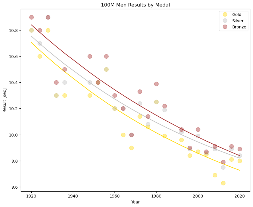 • Plotted the data and fitted an exponential curve for each medal