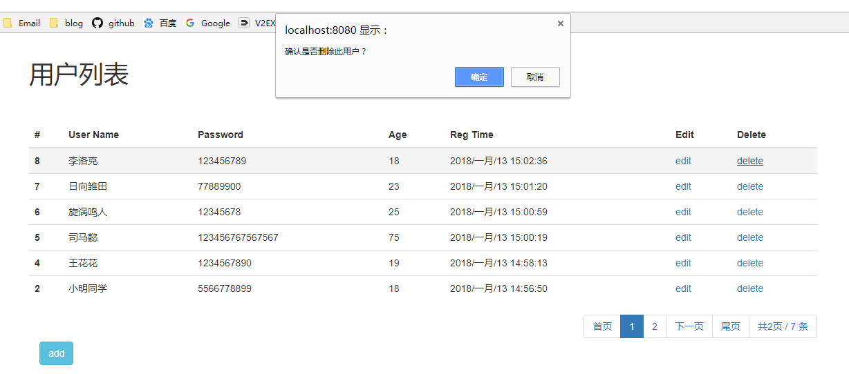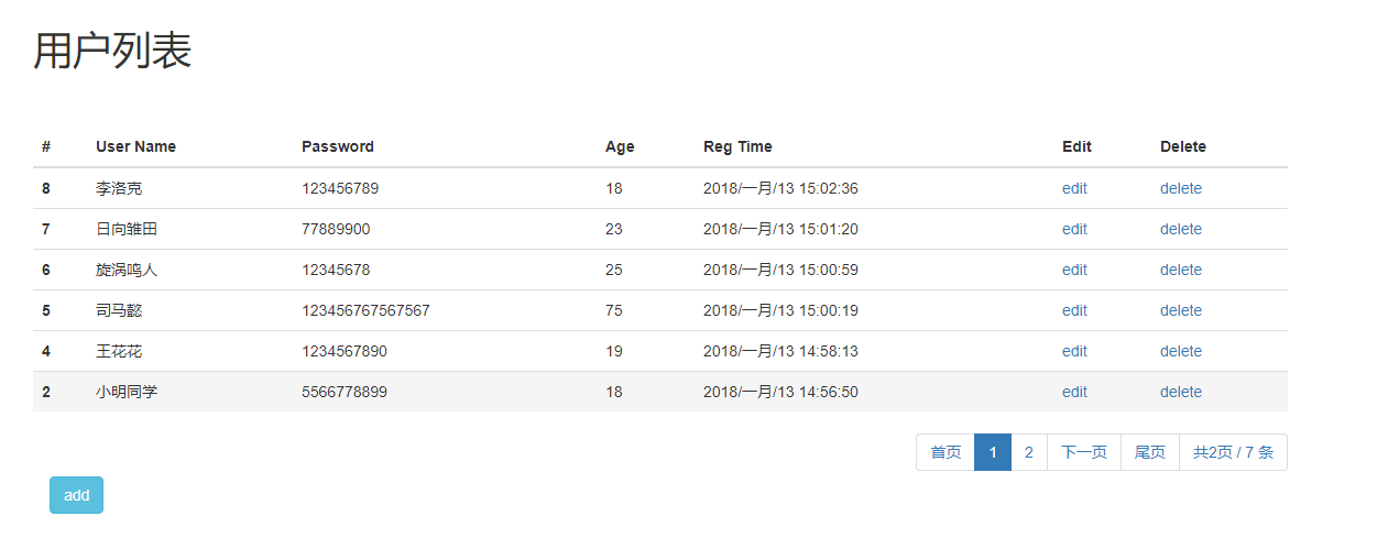 UserController里注入两个不同数据源的mapper,然后获取这两个不同数据源下面的所有的用户列表,前台发起一个请求:http://localhost:8080/getUsers/,看能不能拿到这两个数据源的数据。@Autowired private UserOneMapper userOneMapper; @Autowired private UserTwoMapper userTwoMapper; @RequestMapping("/getUsers") public List<Object> getUsers() { List<User> oneUserList = userOneMapper.selectAll(); List<User> twoUserList = userTwoMapper.selectAll(); List<Object> users = new ArrayList<>(); users.add(oneUserList); users.add(twoUserList); return users; }